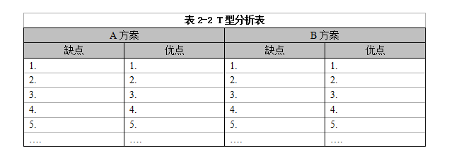面對任何需要決策的難題時(shí),請習(xí)慣性地拿出一張白紙,順手畫一個(gè)T型分析表,做一次T型分析。